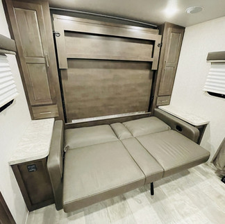 このトレーラーの場合マーフィーベッドは有効と考えます。なぜなら、スライド部がソファーになっており、ダイネットではありません。マーフィーベッドのところが対面式ダイネットになっています。ソファー部(スライド部)がダイネットというモデルが主流ですが、このG20は全長がそれほど長くありません。そのためスライド部をダイネットにすると狭くなるためソファーを配置し、そしてマーフィーベッド部にダイネットを配置したわけです。これであれば全長が短くともそれぞれに座る場所が確保出来るわけです。全長が短いトレーラーであっても4~5名が就寝する箇所に合わせて座る場所もある。こういった場合は有効と思います。